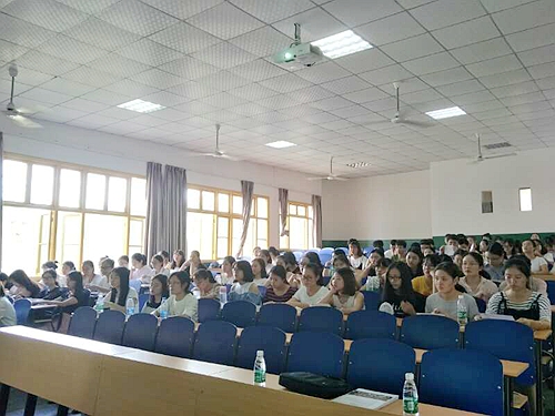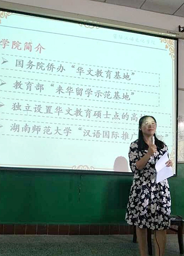 我院硕士点负责人蒋湘平以“小小的学院 大大的世界”为主旨,面向吉首大学中文专业大三学生进行了招生宣讲。她就国汉院基本情况、对外汉语专业研究生培养目标、培养特色、导师队伍、品牌活动等做了全面细致的介绍,并就一些有趣的对外汉语词汇语法问题与学生进行热烈互动,激发该校不少本科生对汉语国际教育和华文教育的浓厚兴趣。